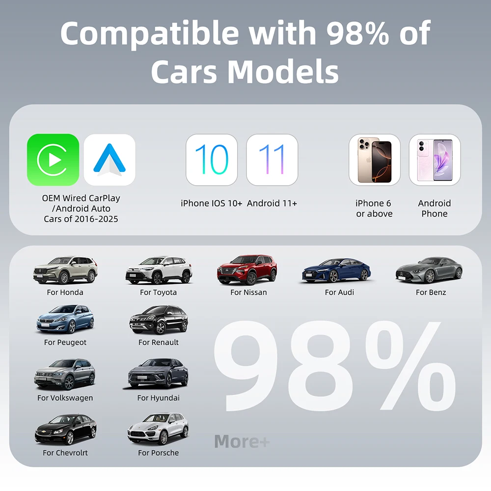 تخيل أنك تدخل سيارتك، ويبدأ نظام CarPlay أو Android Auto تلقائيًا في العمل لاسلكيًا. لا حاجة للبحث عن الكابلات أو القلق بشأن توصيل وفصل هاتفك في كل مرة. مع هذا المحول، يمكنك الاستمتاع بالراحة والحرية التي تستحقها.
