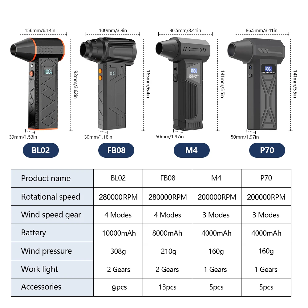 بفضل سرعتها المذهلة التي تصل إلى 280000 دورة في الدقيقة، تولد هذه المروحة ضغط هواء يصل إلى 308 جرام، مما يجعلها مثالية لتنظيف الأجهزة الإلكترونية، السيارات، الأماكن الضيقة، وحتى تجفيف الأسطح بسرعة فائقة.