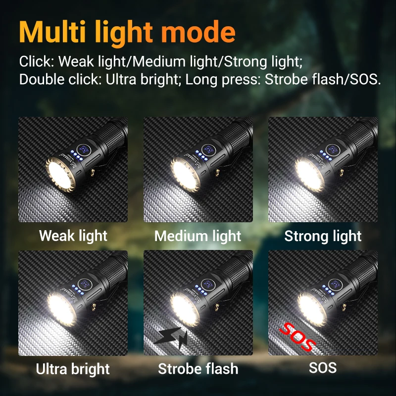 • متعدد الاستخدامات: يأتي المصباح مع عدة أوضاع إضاءة لتلبية احتياجاتك المختلفة، بما في ذلك وضع الإضاءة العالية، المتوسطة، المنخفضة، ووضع الوميض SOS للطوارئ.