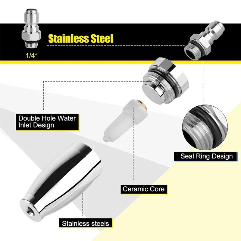 بفضل تركيب التوصيل السريع 1/4 بوصة، يمكنك توصيل هذه الفوهة بسهولة بأي غسالة ضغط متوافقة. وعند الحاجة، يمكنك استخدام إبرة لتنظيف أي انسداد قد يحدث، مما يضمن استمرار عملها بكفاءة عالية.